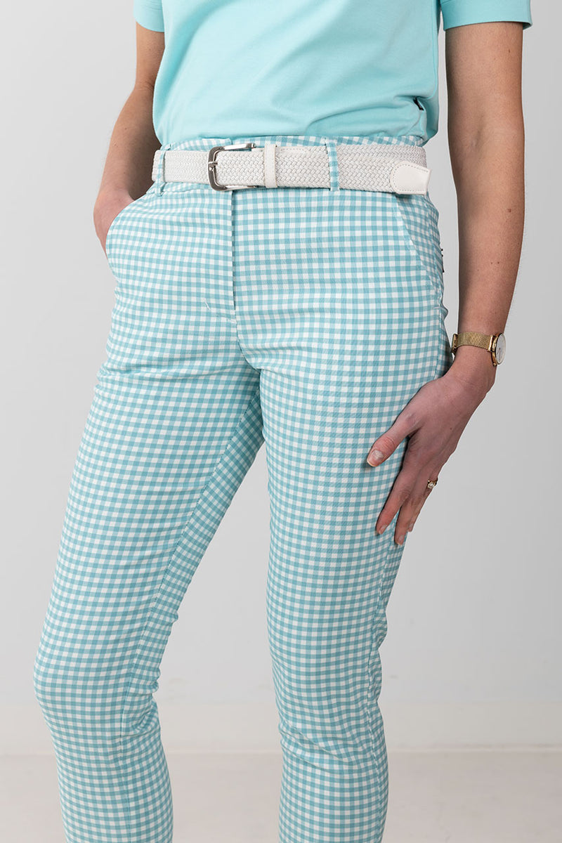 A sleek and elegant capri pant in performance stretch gingham check in a customer loved fit. This slim capri has front slant pockets and a clean waistline. On the back, a jet pocket and a zip pocket for flattering lines. A versatile form fitting pant which suits all figures and can be worn on the course for ultimate performance, or out and about dressed up or down.